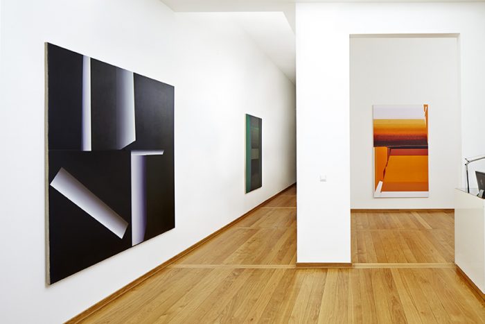Olaf Holzapfels Bilder sind extrem reduzierte Bildobjekte. Die Bilder gehen weniger in die Tiefe, weder illusionistisch noch hermeneutisch, vielmehr wollen sie Präsenz und damit der Wahrnehmungsort ihres Betrachters sein. Man könnte meinen, abstrahierte Landschaften zu erkennen, Innenräume, Schatten, Samples aus alten Gemälden, Verkehrskreuzungen, immer wieder sind es Situationen des Übergangs vom Innen- in den Außenraum. Die Bilder zeigen Virtuelle Räume, deren Perspektiven ausserhalb des Bildes liegen, sie sind Eintritte in eine zeitgenössische Bildwelt, die vorwiegend elektronisch artikuliert wird, die sich strukturiert gibt und dennoch immer Teil der physischen Ereignisse bleibt. Für Holzapfel ist Malerei diese nichtauflösbare Verbindung von zweiter in die dritte Dimension.