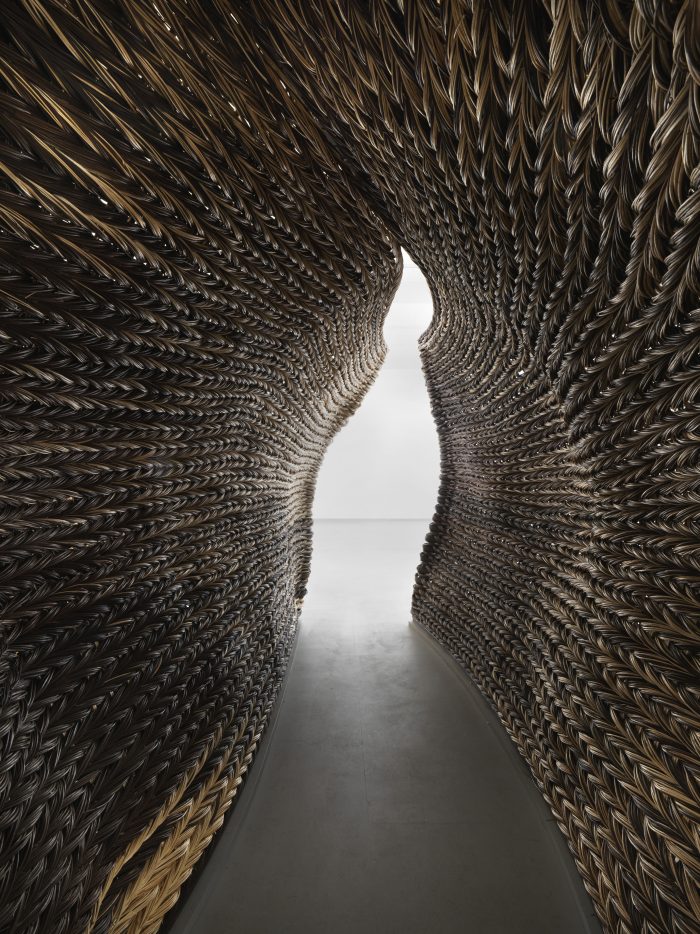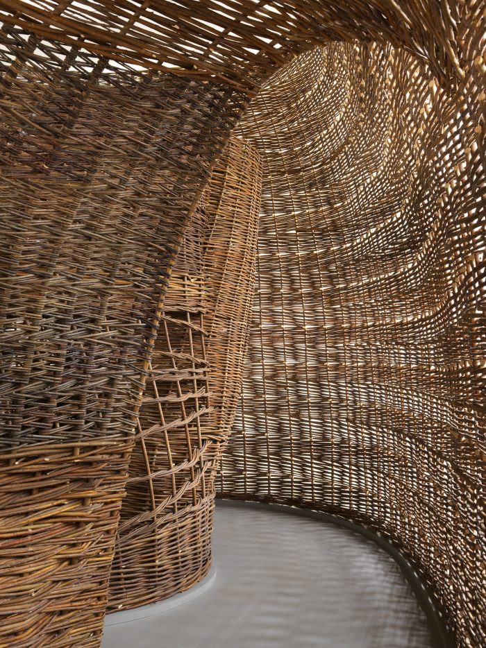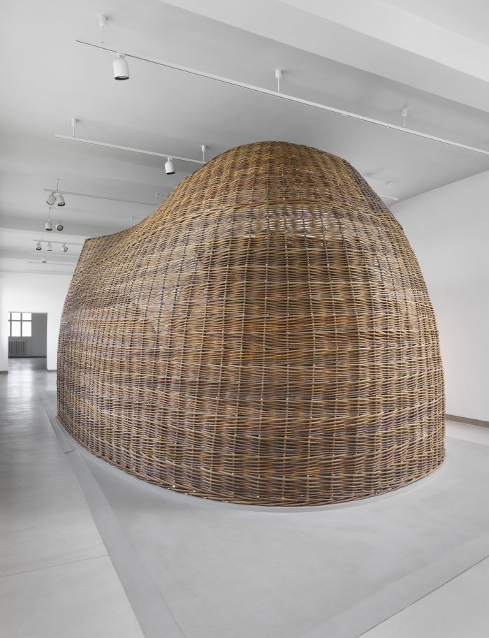 Olaf Holzapfel, together with master weavers Klaus Titze, Ralf Eggert, and Fred Jakob, has created a 60-square-meter installation titled 'The Woven Garden' for the exhibition. This installation is an immersive spatial experience. The woven walls surround the visitors, enveloping them and conveying the intensity of the weaving craft, the physical bending of the willow branches, and the creative intent behind this work. It is both a physical and a visual experience, as in this cultural technique, the process remains ever-present, visible, and understandable. This also holds significance for sustainable spatial design in architecture, as well as for art, which always engages with general design questions. One of these questions is: How do we get closer to that physical space and how can we shape it? What does that mean for us?