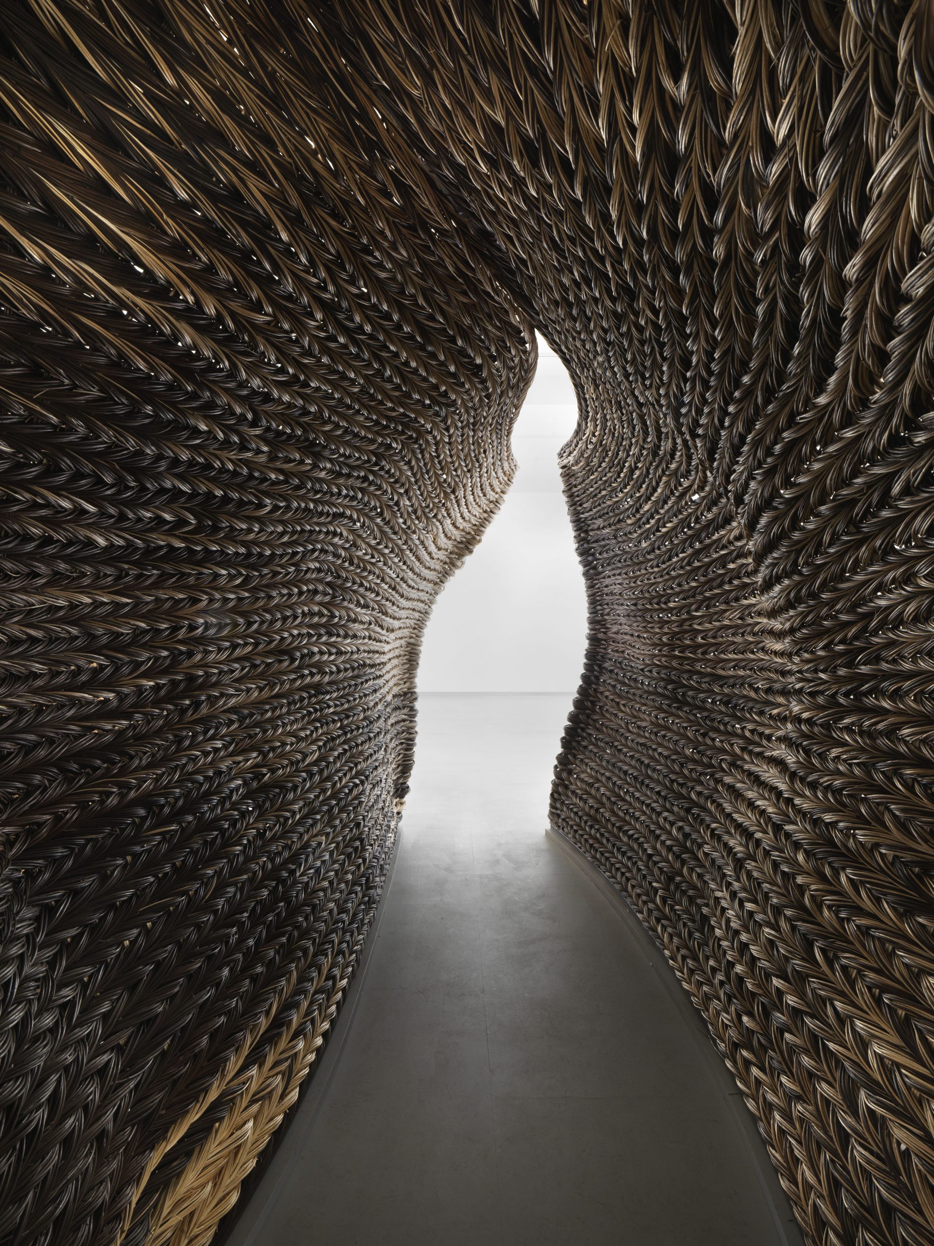 The exhibition 'All Hands on: Weaving' explores the intangible cultural heritage of braiding techniques. Braiding is a universal language that is thousands of years old and primarily exists as a regional language, as it involves weaving what is needed locally from materials available in the surrounding landscapes. These materials can include grasses, split woods, thin branches, hair, ropes, and so on. At the same time, braiding is a fundamental form of abstraction, which is why it has always extended into the language of visual art and philosophy. In braiding, surfaces are created from linear materials and curved into spaces.