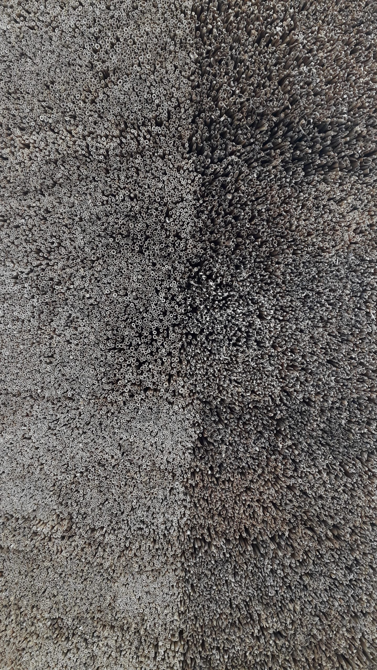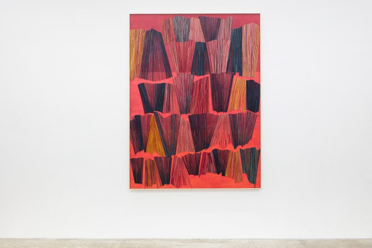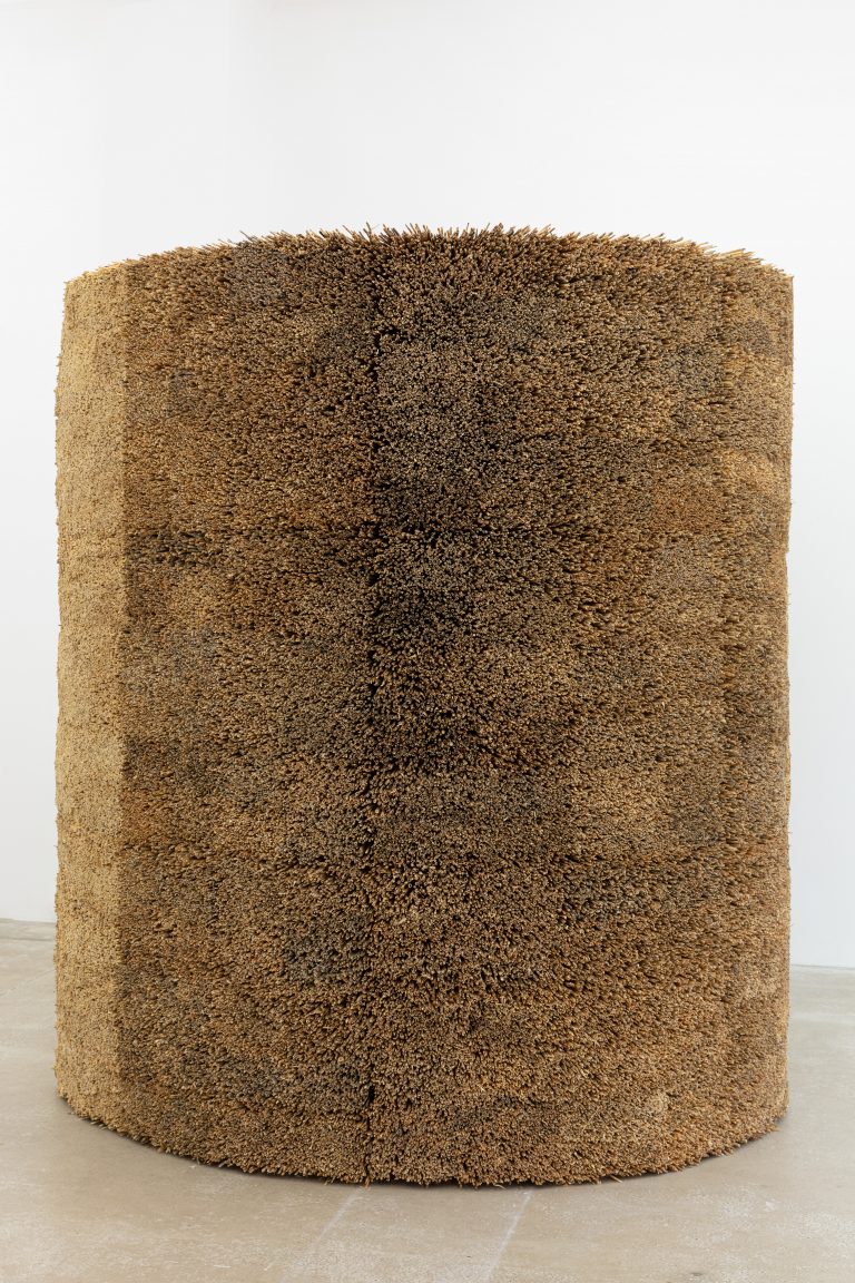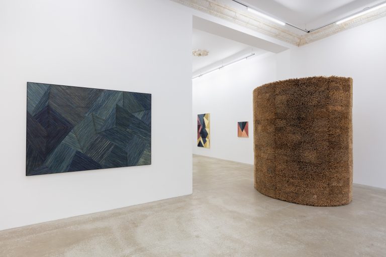 For the last ten years, Holzapfel has been delving into natural materials and space. In the exhibition, we are showing new straw pictures and a work made of reeds. A fiber is the smallest component of natural plant-based materials. In their repeated arrangement, fibers shape the organization and appearance of the material pictures and sculptures. In Holzapfel’s pictures, light, color, and real and illusionistic pictorial spatiality play a central role. The pictures seek to overcome the rupture between depiction and what is depicted; they describe directly what they are. They are thus mimetic and yet completely nonrepresentational; it is as if they open up spaces that start in the concrete material. Viewing them, one constantly changes perspective: are we seeing material, or a pictorial space? This is definitely one of the artist’s central interests; he already formulated “being in between” in “FENCE”, his contribution to the documenta 14. The sculpture “Coat”, a single bundle of reeds layered to create a bent wall, also carries the idea of the work “FENCE” further. In the simultaneous emphasis on material, language, information, and media reflection, what is visible is not the only thing that plays a role; so does sensing the simultaneity of the widest variety of media spaces – exformation and information in a world driven by data.
