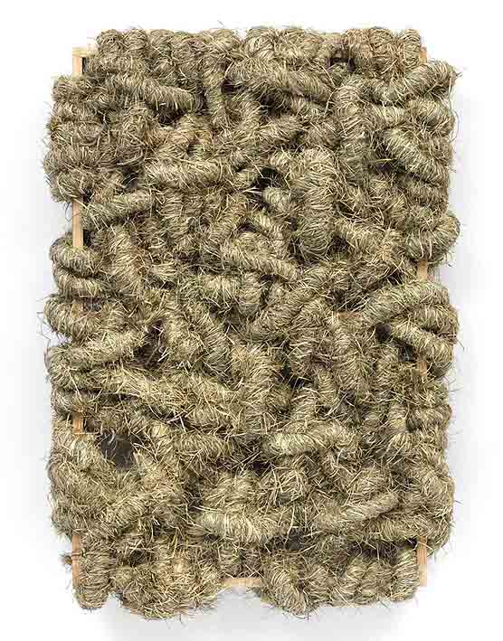 In seinen Installationen aus flexiblen ineinander verschachtelten Hartkarton-Pappen entwickelt Holzapfel labile Architekturen und Behausungen. Mit farbigen Polyamidfäden werden die in einer Art Stecktechnik zu riesigen Objekten zusammengesetzten Elemente im Raum fixiert und zu optischen Raumzeichnungen verspannt. Neben Hartfaserpappe als Material des Provisorischen verwendet Holzapfel auch eine Naturfaser, die von der indigenen Ethnie „Wichi“ in Nordargentinien hergestellt wird. Das igluförmige Zelt aus netzartigem Gewebe ist mit abstrakter Ornamentik überzogen und verweist – ebenso wie der Einbezug von traditionellen Strohseilen in seinen Reliefs – auf den fruchtbaren Transfer von Kulturtechniken. Auch die architektonischen Konstruktionen aus Holzbalken zitieren in ihrer handwerklichen Bauweise einen klassischen Zweig der Zimmermannskunst und nehmen in ihrer Gestalt zugleich Bezug auf konstruktivistische Modelle utopischer Architektur. Die Installation enthält serielle Formelemente, die erst in den 1960er Jahren Eingang in die Geschichte der Skulptur gefunden haben, und vollzieht einen Spannungsbogen von Skulptur und Architektur, Tradition und Avantgarde. (https://www.madeingermanyzwei.de)